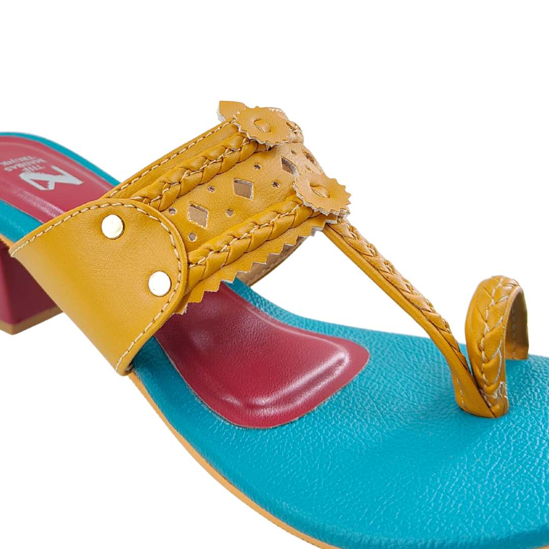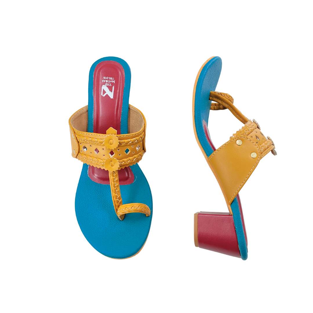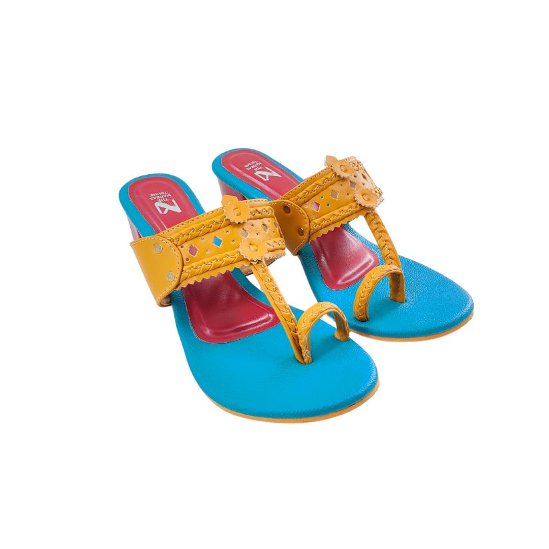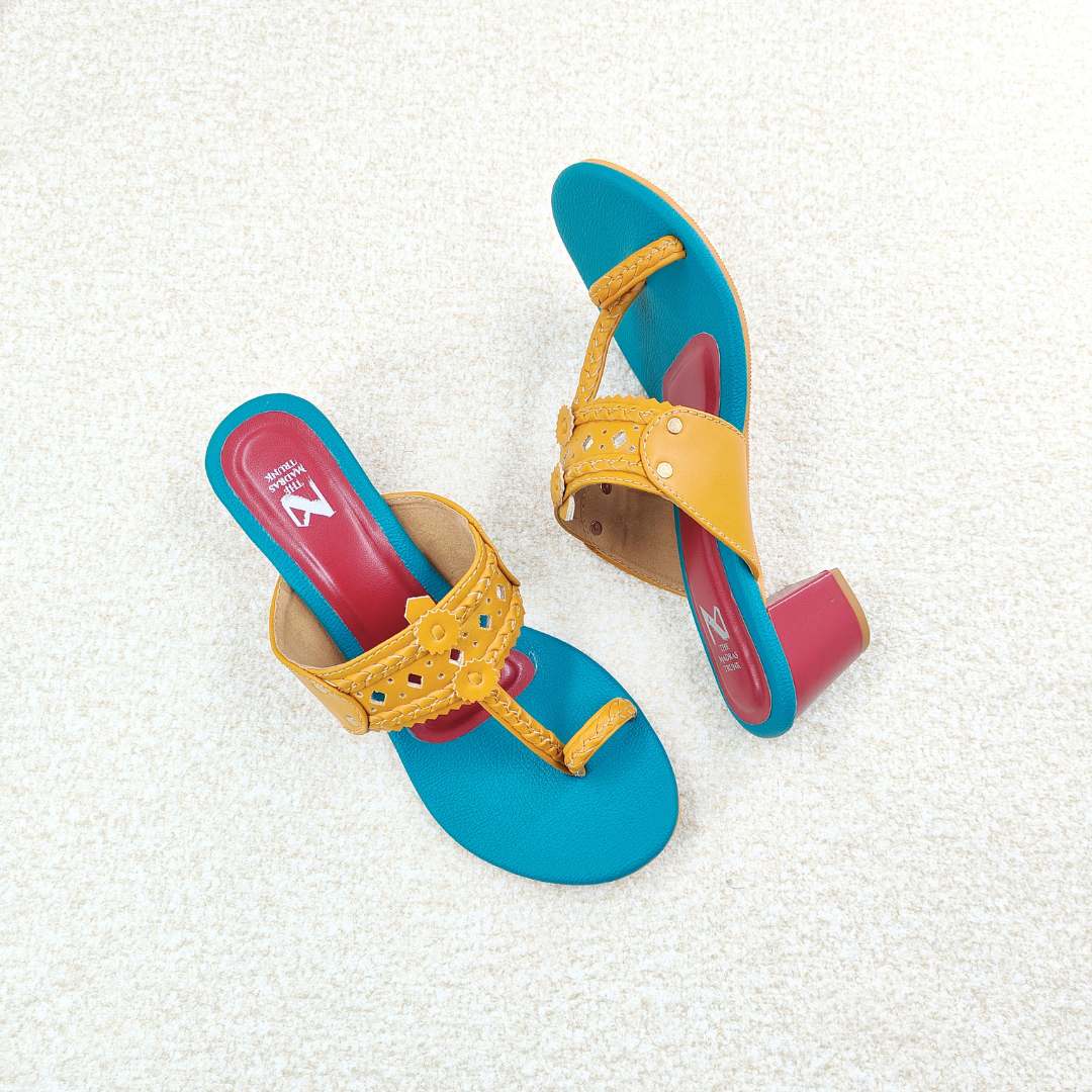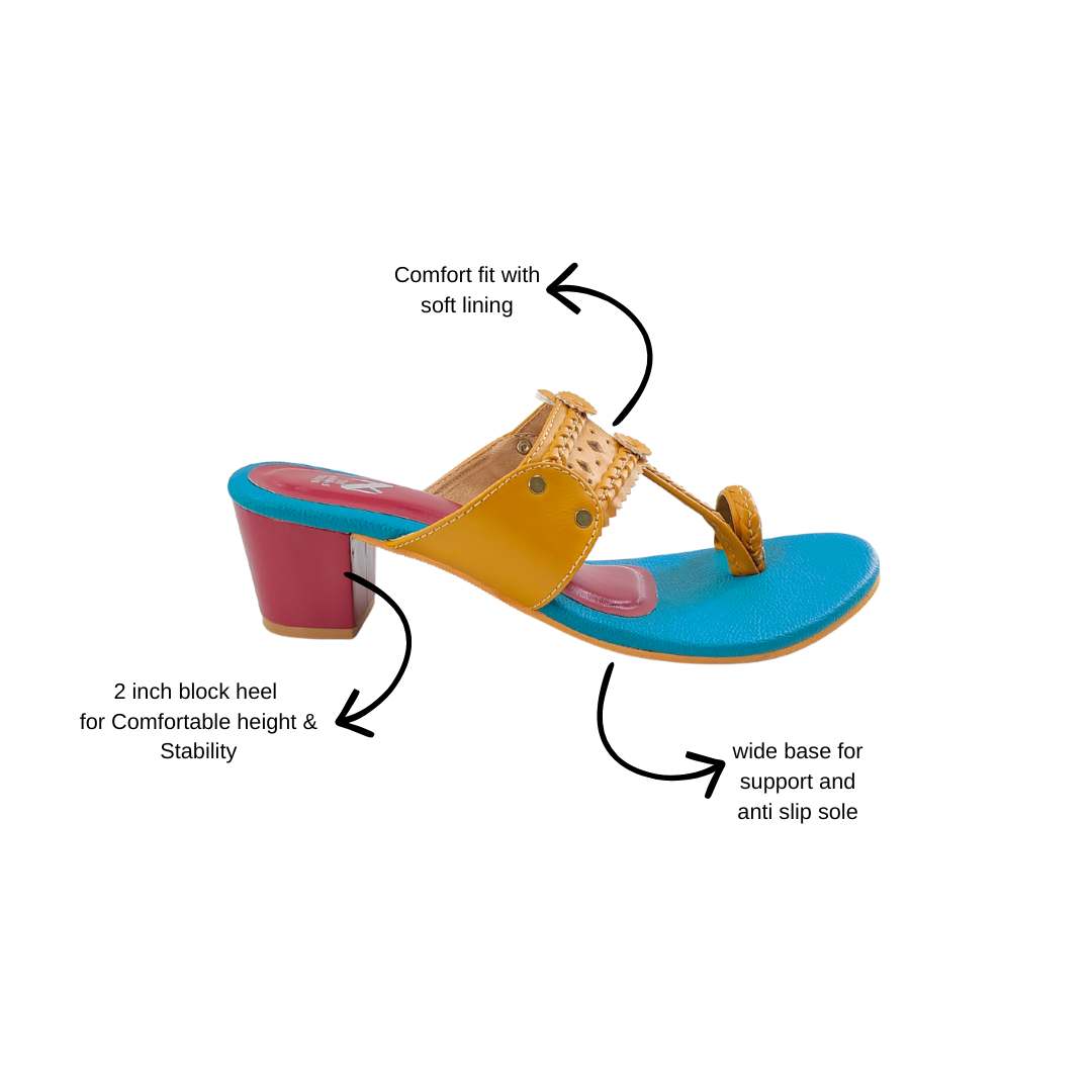 Inspired by the vibrant colours of celebration, the Gulal Series brings a playful twist to classic Kolhapuris. Crafted with intricate details and finished with comfortable block heels, these pairs add a pop of colour to everyday style.
